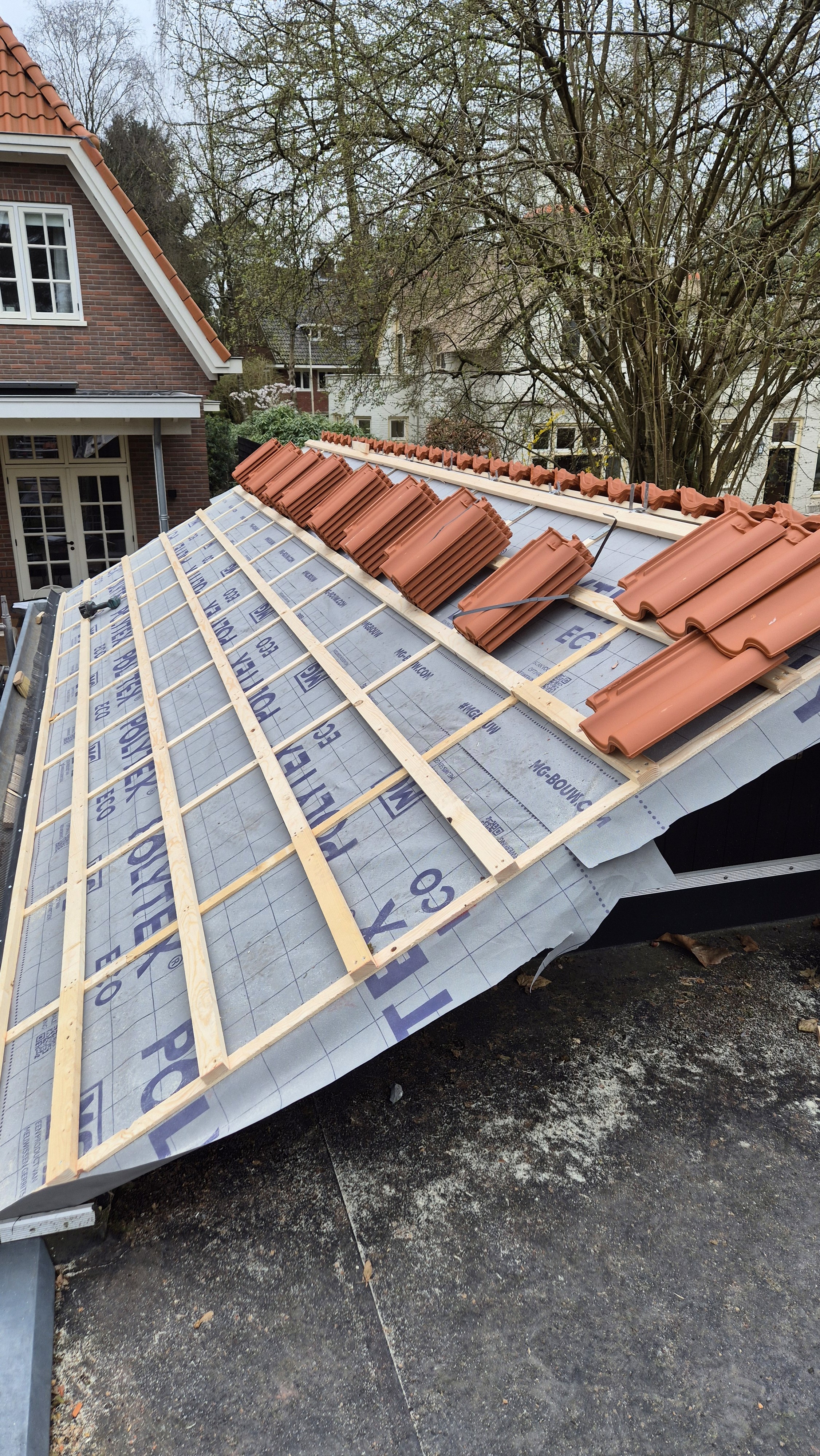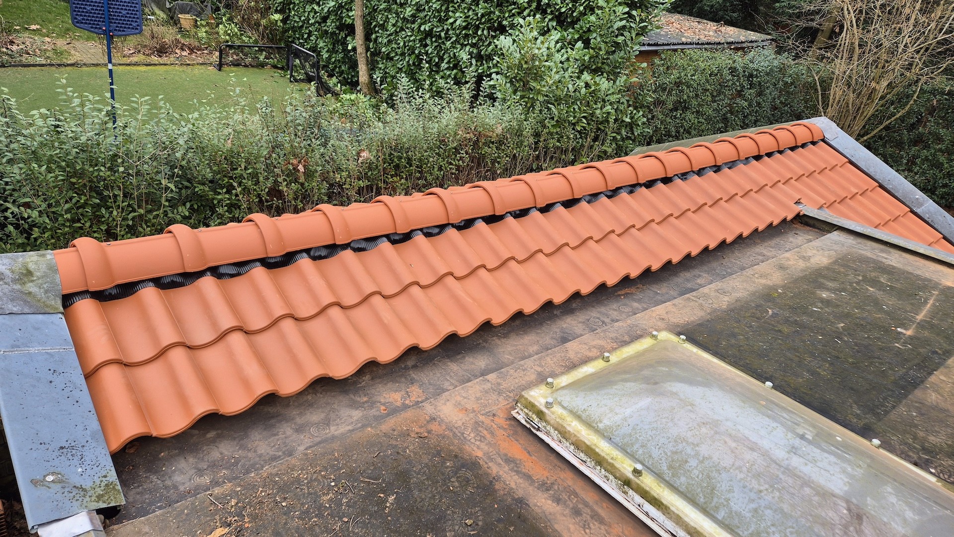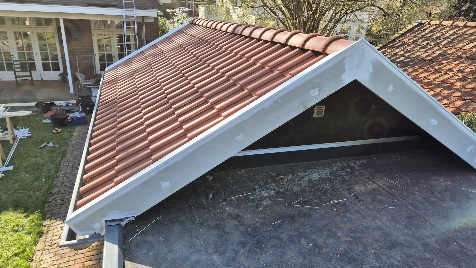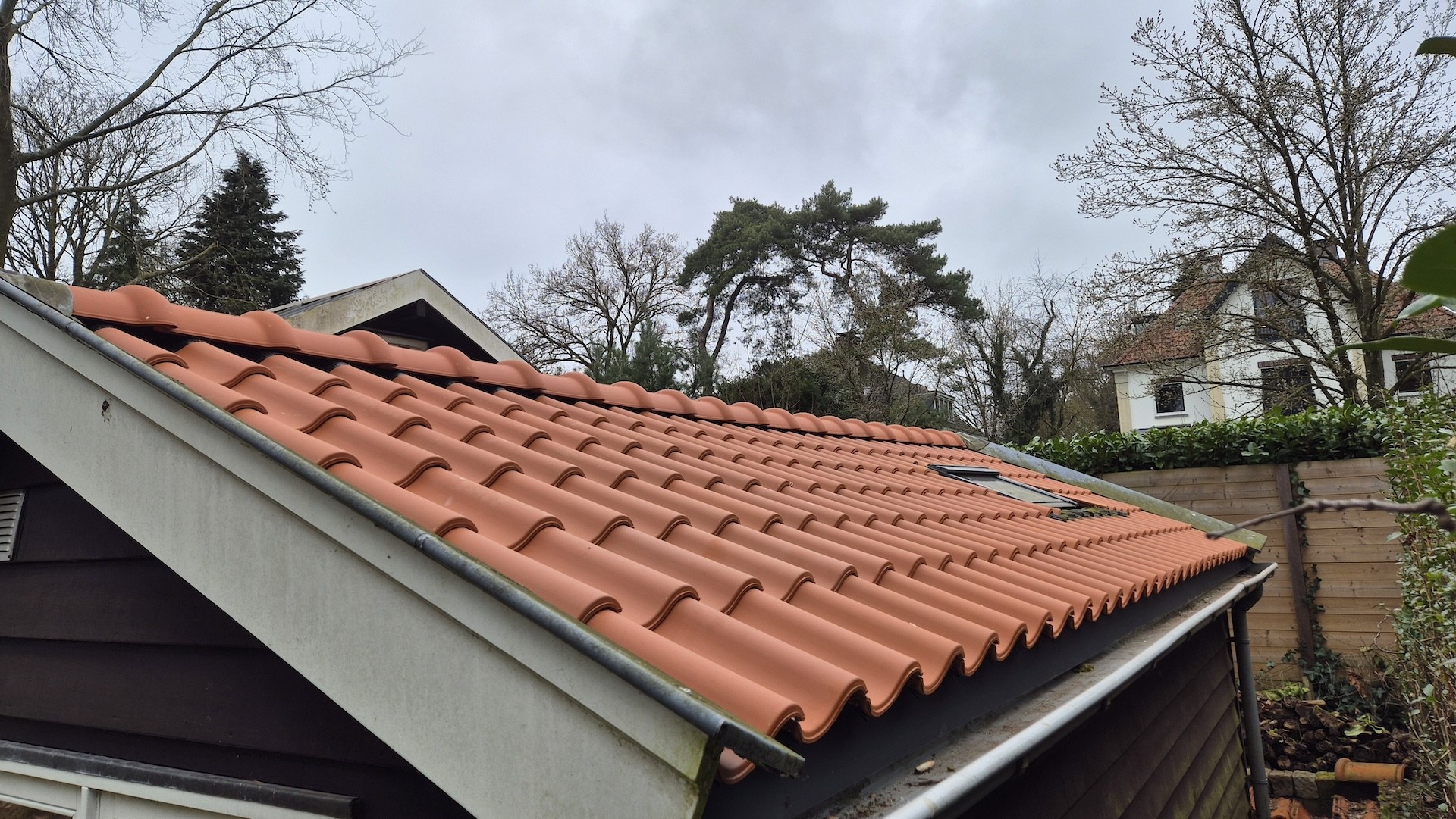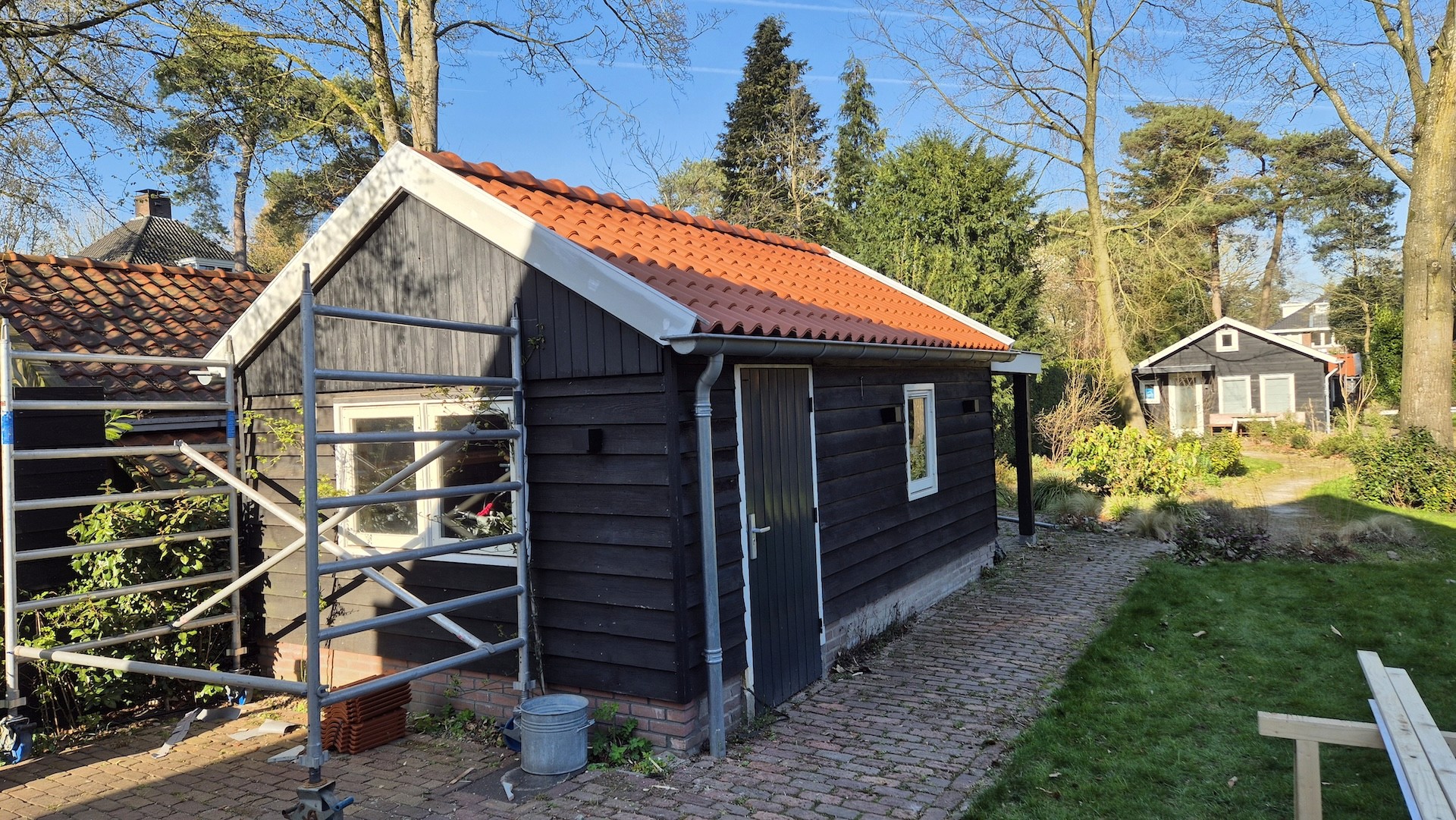 Voor deze berging in Bilthoven hebben wij de volledige kap gerenoveerd. De bestaande dakconstructie is vernieuwd en voorzien van nieuwe panlatten, folie en dakpannen, waardoor het dak weer volledig voldoet aan de eisen van deze tijd. Naast de technische vernieuwing hebben we ook gezorgd voor een strakke afwerking, zodat het geheel weer netjes aansluit bij de uitstraling van de woning en de tuin. Het resultaat is een duurzame en verzorgde kap die weer jarenlang meegaat.