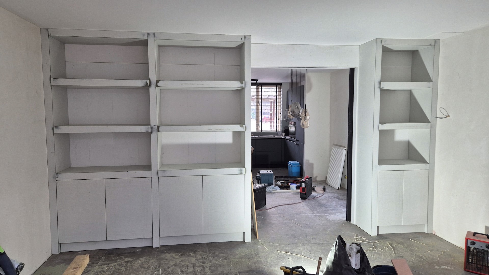 Voor deze woning in Ermelo hebben wij een maatwerk kastenwand en TV-meubel gerealiseerd, volledig afgestemd op de ruimte en wensen van de klant. De kastenwand is strak geïntegreerd in de bestaande opening en voorzien van open vakken met verlichting, wat zorgt voor een warme en moderne uitstraling. In combinatie met het op maat gemaakte TV-meubel ontstaat er één geheel dat zowel praktisch als stijlvol is.